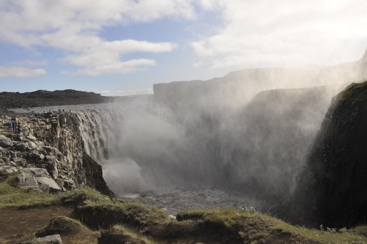 To znaczy nie całkiem przy nim. Jak na razie widzimy mgłę nad miejscem, gdzie powinien być. Do wodospadu trzeba dojść. Zejść z wysokiej skarpy. Wrażenia są dozowane. Najpierw widać kanion, jaki wyżłobiła rzeka niosąca wody z lodowca Vatnajokull.