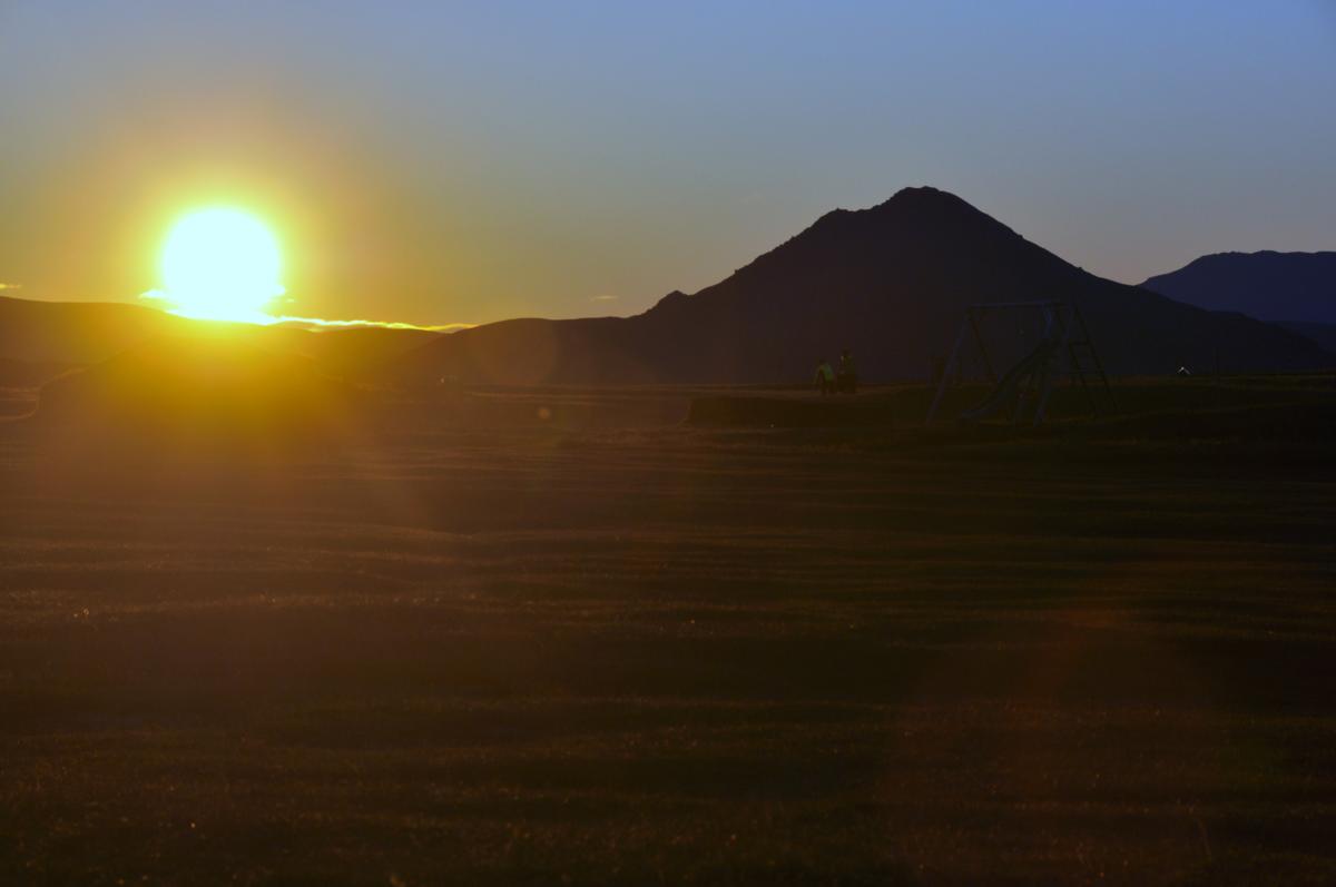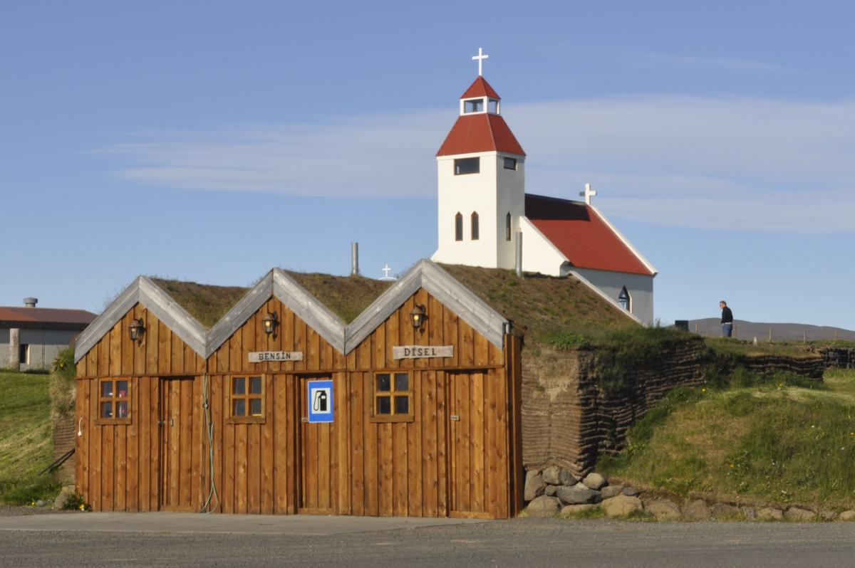 Do jedynki mamy kilka kilometrów. Po dziesięciu minutach jesteśmy na obwodnicy. Szukamy noclegu. Jest już późnawo i jesteśmy głodni, więc trzeba znaleźć coś co pozwoli nam jakoś przetrwać noc. Przejeżdżamy przez pasmo wzgórz i jakieś 30 kilometrów od tarkowej drogi mamy skierowanie na pole namiotowe. Skręcam. Dojeżdżam do wioski Modrudalur. To już duża wieś! Prawie miasteczko! Ma kościół i stację benzynową. Poza tym jest, to punkt wypadowy na wyjazdy 4x4 po interiorze. Ma duże pole namiotowe i kilka domków do wynajęcia.